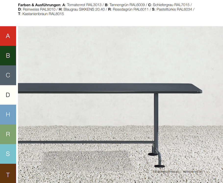 Der Atelier Alinea klassische Gartentisch ist klappbar und wird mit viel Handarbeit gefertigt. Die Tischplatte ist in mehreren Farben erhältlich und es gibt den Gartentisch auch in diversen weiteren Grössen.