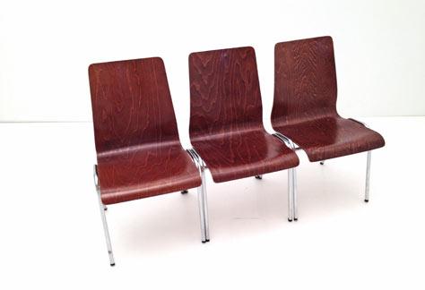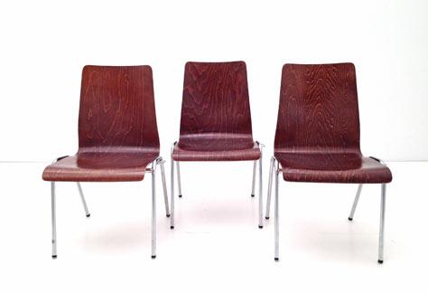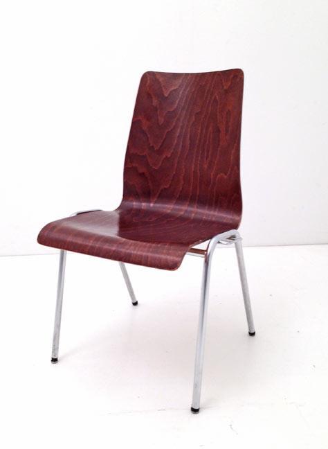 Einfache Stapelstühle. <br> Formschichtholz rötlich gebeizt, lackiert. <br>