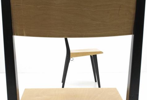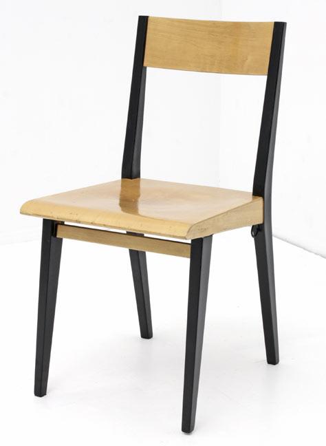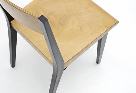 Gradliniger Holzstuhl, schnittiges Seitenprofil.