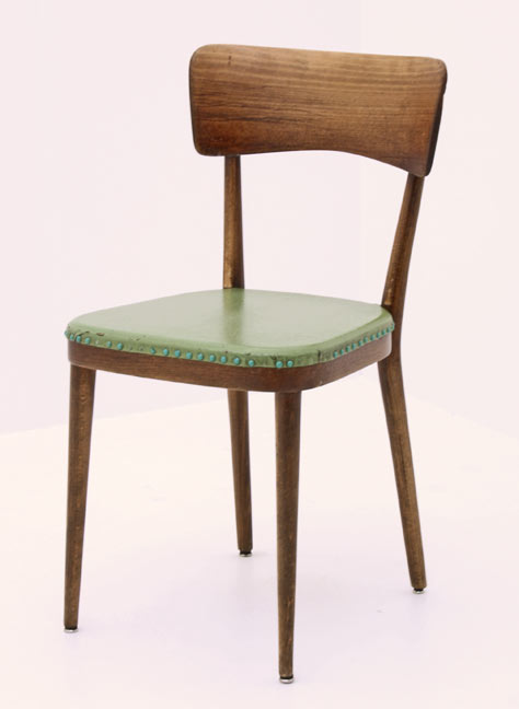 Fein geformter Holzstuhl. Sitzfläche leicht gepolstert und mit Kunstleder bespannt. <br>