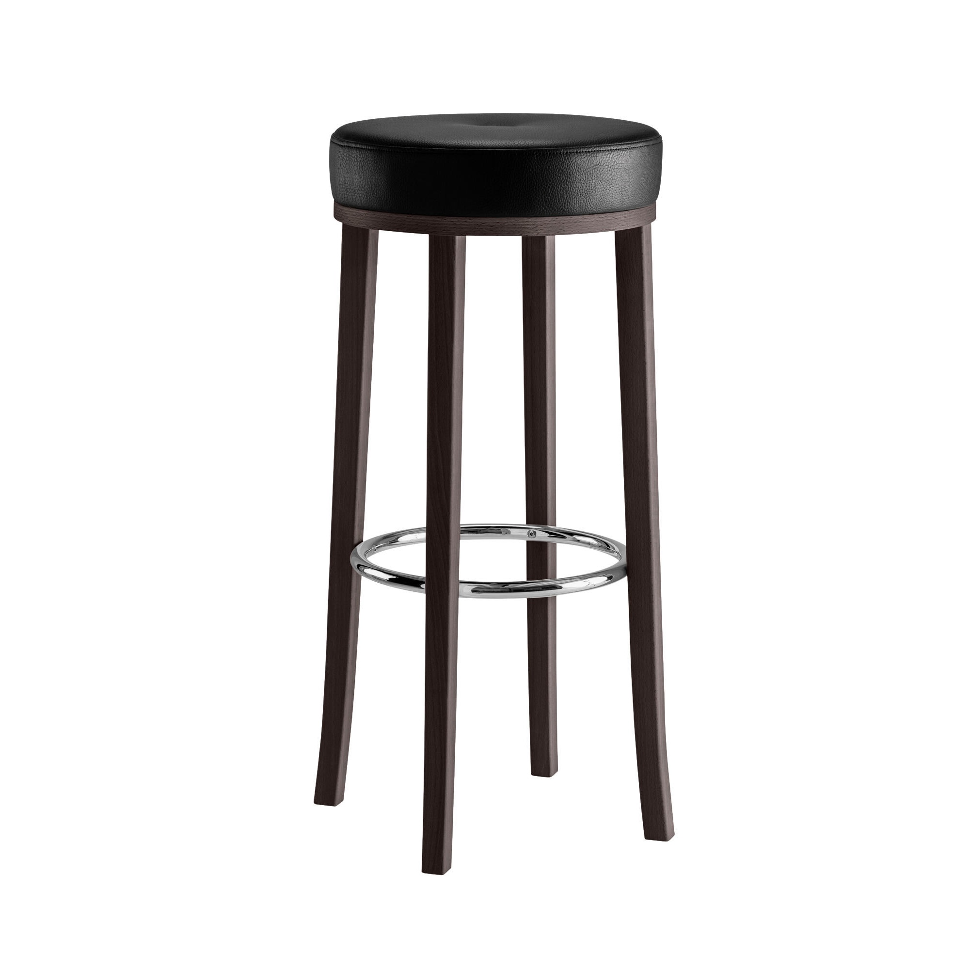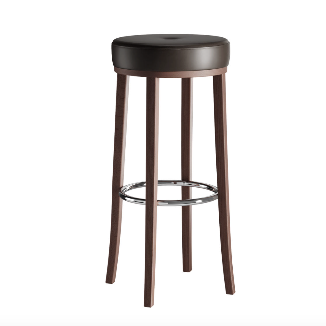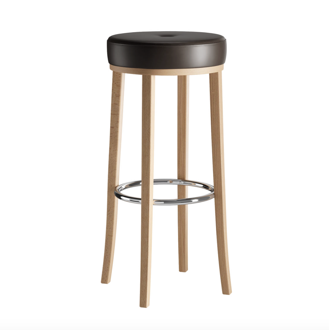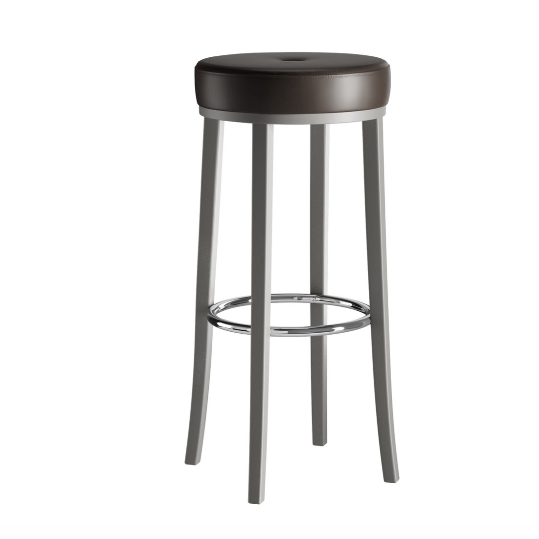 Bequemer horgenglarus Barhocker mit gepolsterter Sitzfläche und verchromtem Stahlrohr Fussring. Mit Stoff oder Leder Bezug und in diversen Farben neu erhältlich.