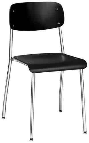 Sitz- und Rückenteil aus Formsperrholz, Metallgestell verchromt, sichtbar genietet, stapelbar, Reihenverbindung möglich.