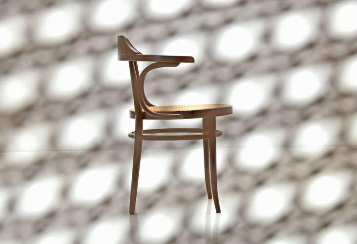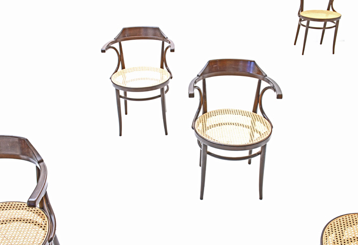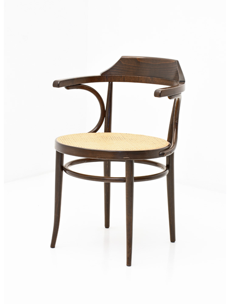 Klassischer Thonet Stuhl mit Jonc-Geflecht und Armlehnen. Dunkelbraun gebeizter Stuhlrahmen, in gutem Zustand.