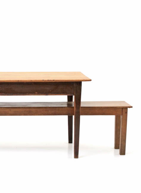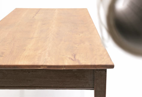 Dunkel lackiertes Untergestell und hellere, restaurierte Tischplatte aus Buchenholz mit aussergewöhnlicher Holzmaserung.