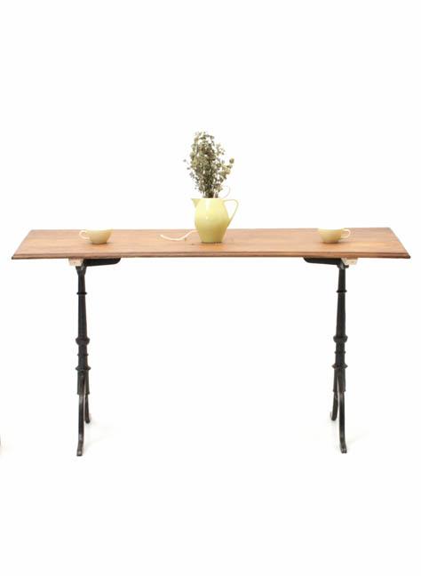 Bistrotisch der Jahrhundertwende mit Gusseisenfüssen nach Wahl und einer dunkel geölten Buche Platte mit Karnieskante.