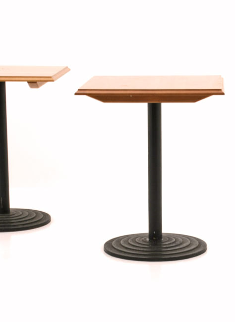 Kleine 2er Tische. Buchenholz mit Karniskante. Schwerer Gussfuss mit Reliefmuster.