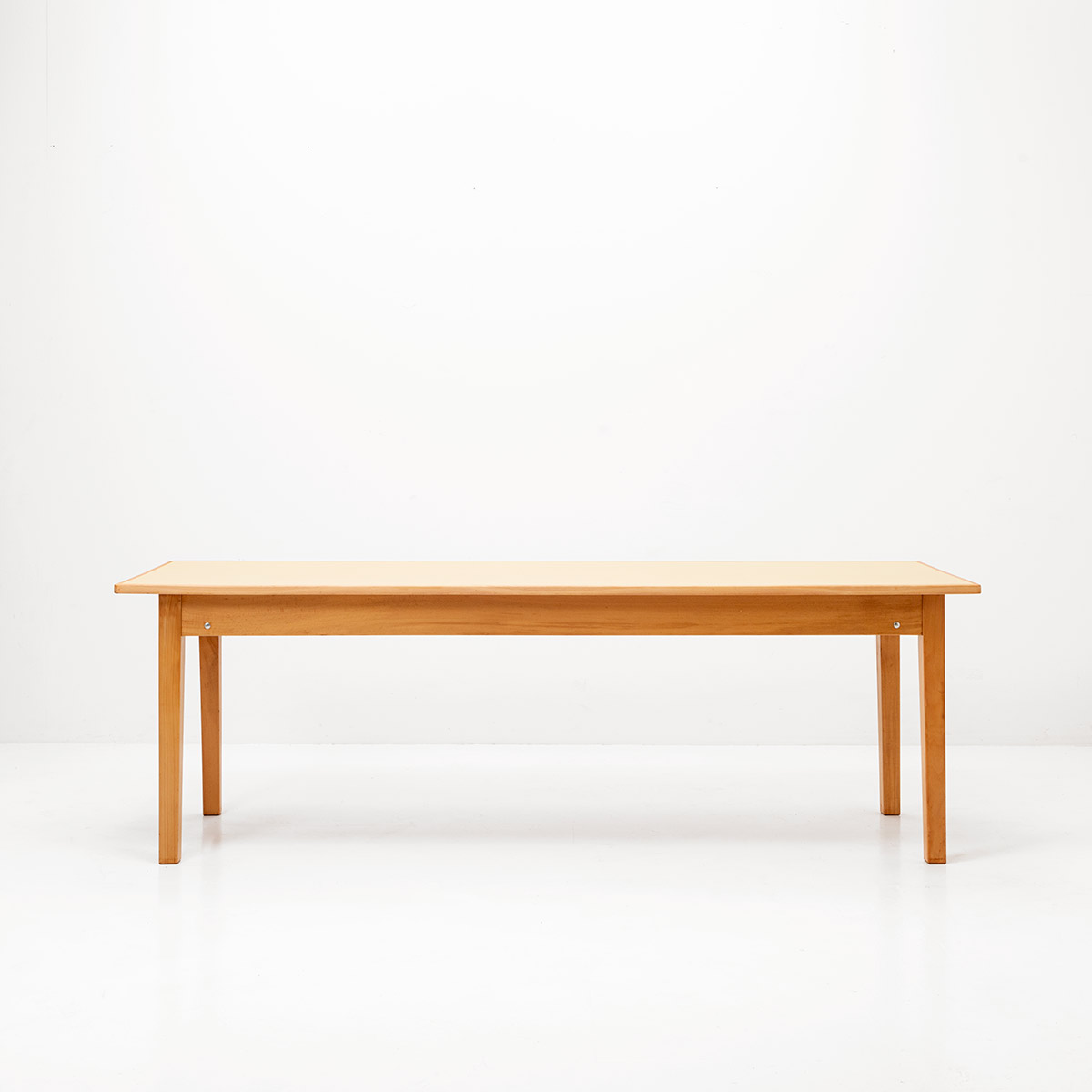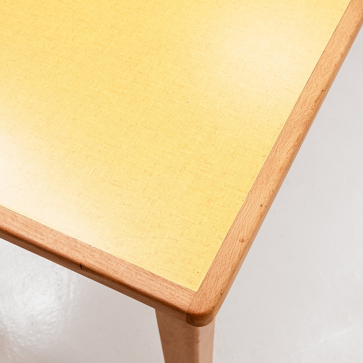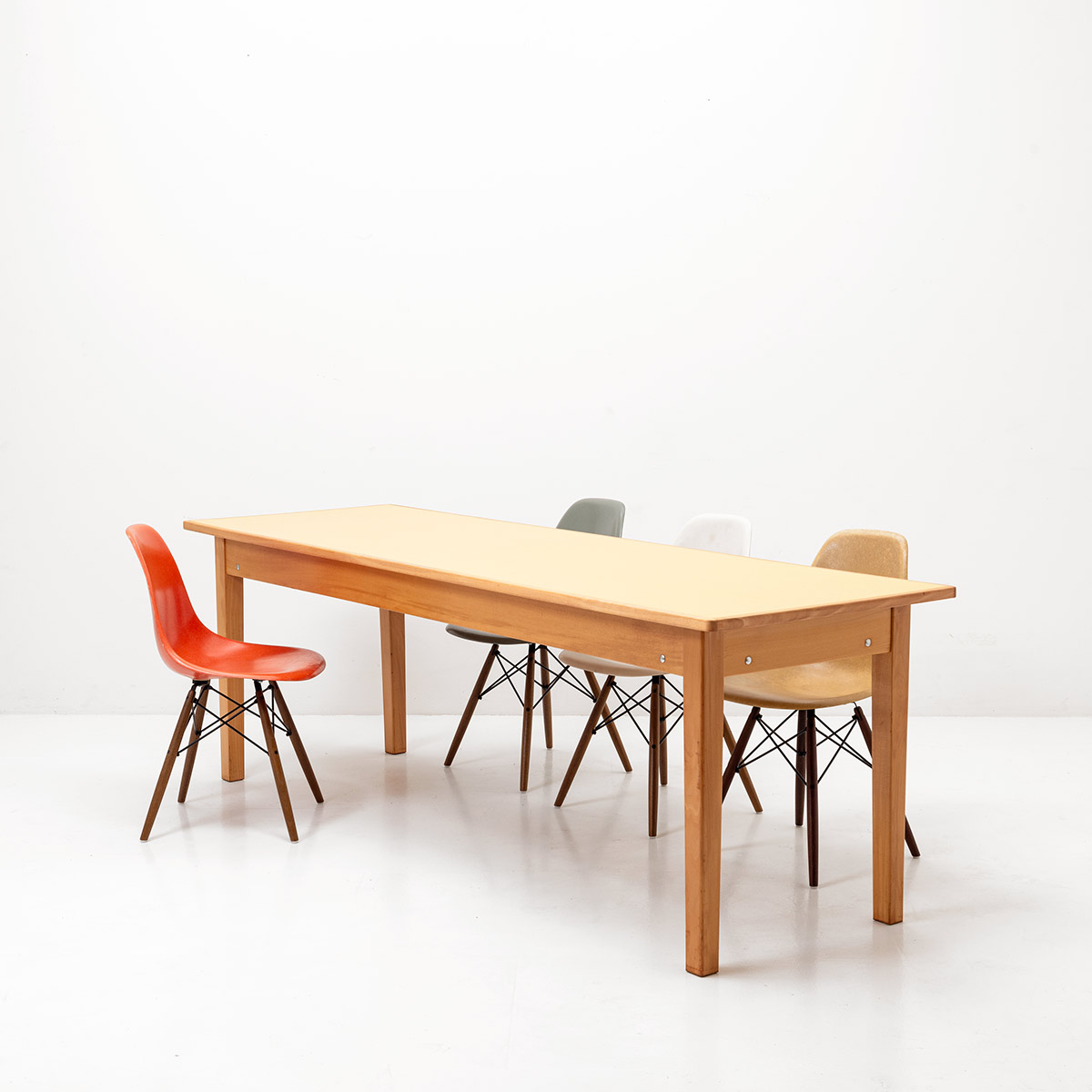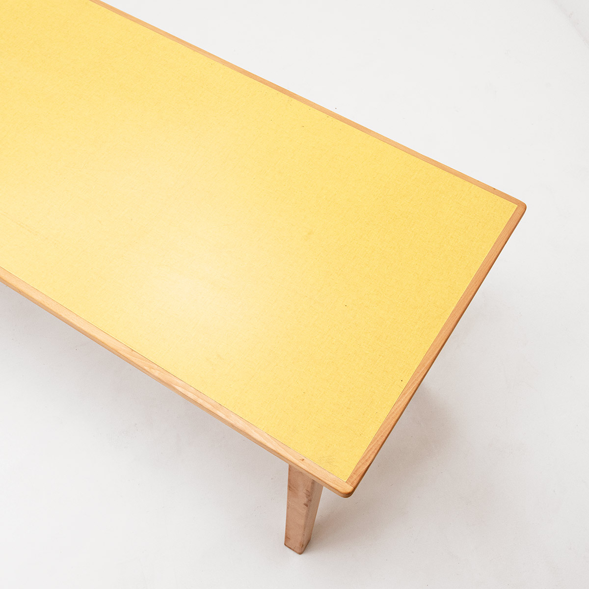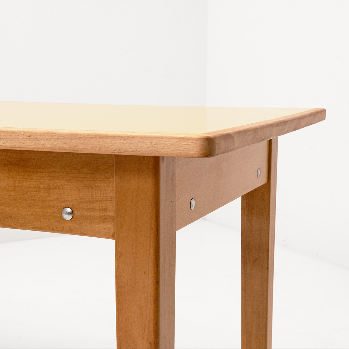 Grosser, längliche Tische aus massivem Buchenholz. Tischblatt aus maseriertem, gelblichem Resopal (Kunstharz), typisches Muster aus den 60er Jahren. Massivholzumleimer in Buche, Hersteller horgenglarus.