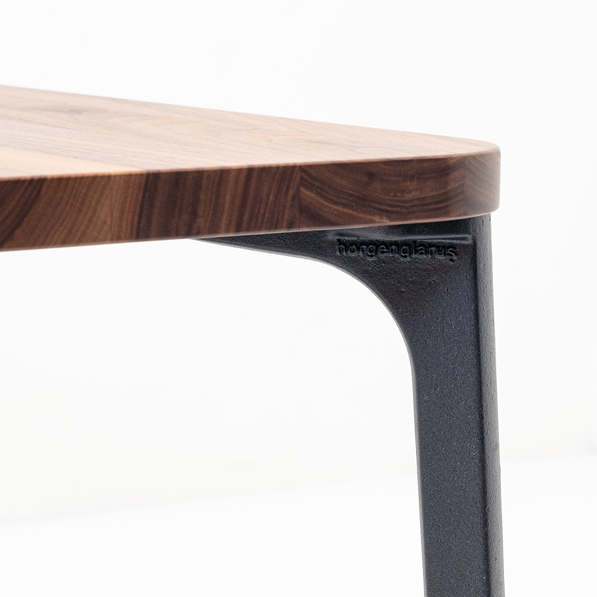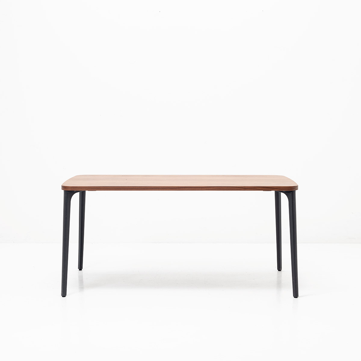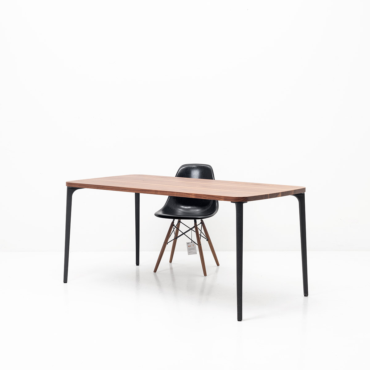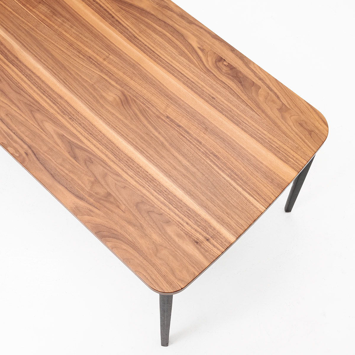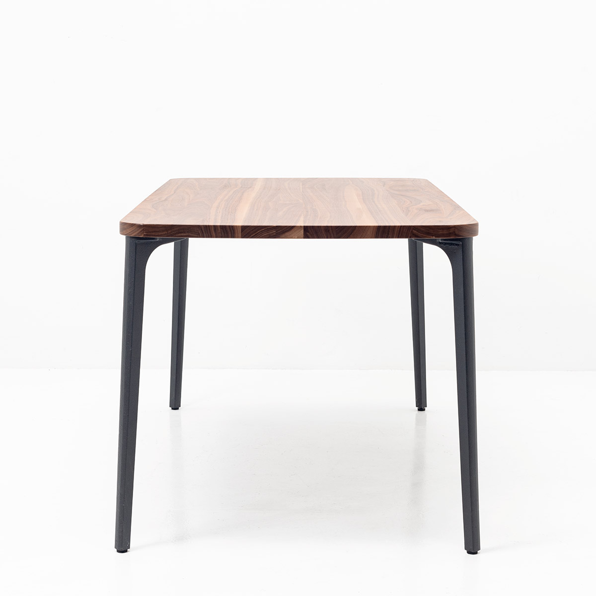 Der Tisch Modell podia 1802 mit Eckradius 8cm, die Schmalseiten sind leicht korbbogenförmig. Das Tischblatt ist aus massivem Nussbaum und hat eine wunderbare Holzmaserung.