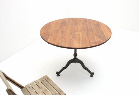 Schöner, runder Kirschbaum-Bistrotisch mit gerader Kante und speziellem, schnörkeligem Zentralfuss. Der Tisch hat einen Durchmesser von über 1m und wurde restauriert und geölt.
